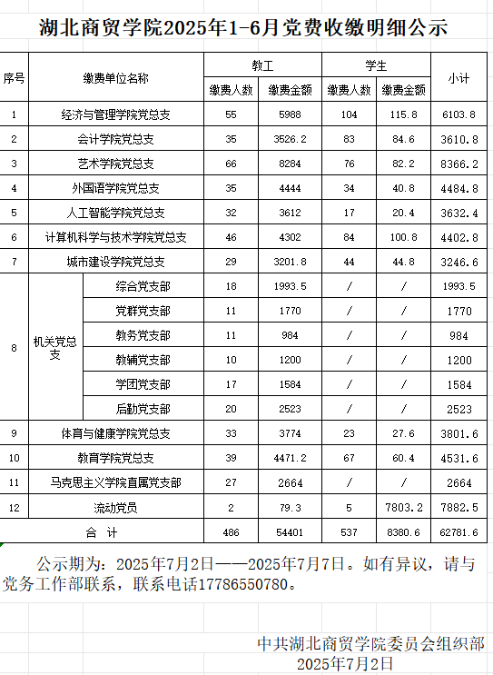 湖北商贸学院2025年1-6月党费收缴明细公示