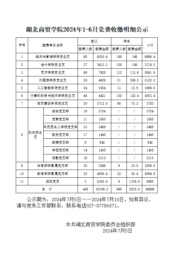 湖北商贸学院2024年1-6月党费收缴明细公示
